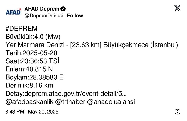 AFAD, İstanbul’da Büyükçekmece açıklarında 4.0 büyüklüğünde zelzele meydana geldiğini açıkladı. Kandilli Rasathanesi ise zelzelenin büyüklüğünü 4.2 olarak duyurdu.