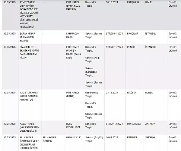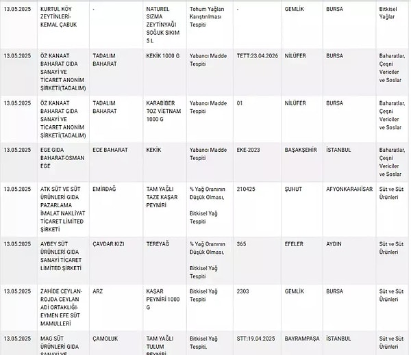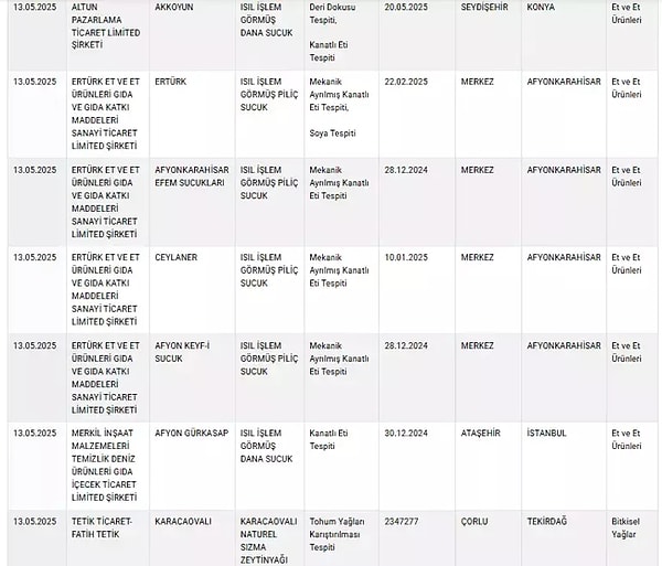 13 Mayıs tarihli değişiklikte listeye çok sayıda zeytinyağı, tereyağı ve peynir üreticisi dahil edilirken, listenin en dikkat çeken kısmı ise mevzuata muhalif üretim yaptığı tespit edilen sucuk markaları oldu.