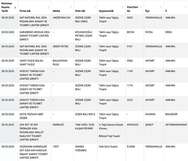 Tarım ve Orman Bakanlığı taklit ve tağşiş yapılan besinler listesini yeni sahtecilikleri ekleyerek güncelledi. 28 Mayıs’ta yayımlanan yeni ifşalarda birçok eserdeki meseleler gün yüzüne çıktı. Lahmacundan yoğurta, börekten bala birçok eserde yapılan hileler bakanlık tarafından ifşa edildi.