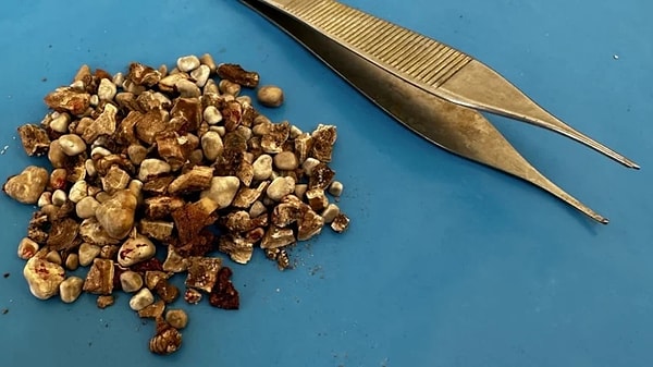 ‘Önce bir tarafı temizledik, çok zahmetli olacak diye temel büyük olanı sona bıraktık. Bir seansta bir tarafı temizledikten sonra ortaya bir müddet koyduk, hasta güzelleşti. İkinci seansta da 5 santimlik olan taş kısmını boşalttık. Tek tek taşları toplamak yaklaşık 4 saate yakın süren şiddetli, çetin ameliyat oldu. Bu büyüklükte bir taş görüyorsak çoklukla bu taşlar tek modül halinde olur. Biz onları kırarak küçültürüz. Boncuk tanesi üzere küçük yüzlerce taşı bir ortada görmek bizim için de tecrübe oldu.’