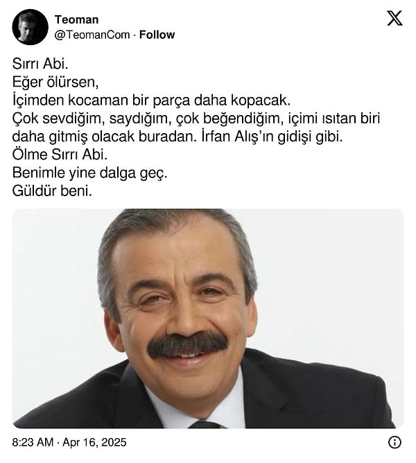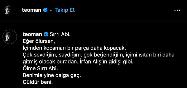 Şarkıcı Teoman, toplumsal medya hesabından Sırrı Süreyya Başkan için yaptığı paylaşım da “Ölme Sırrı Abi” dedi.