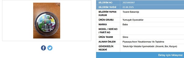 Ticaret Bakanlığı, çocuklara yönelik ürünlerde güvenlik kontrollerini sürdürüyor. Bakanlık, ‘Baba’ markasına ilişkin bir slime içeriğinde insan sıhhatine zararlı arsenik, bor ve kurşun maddeleri tespit etti.