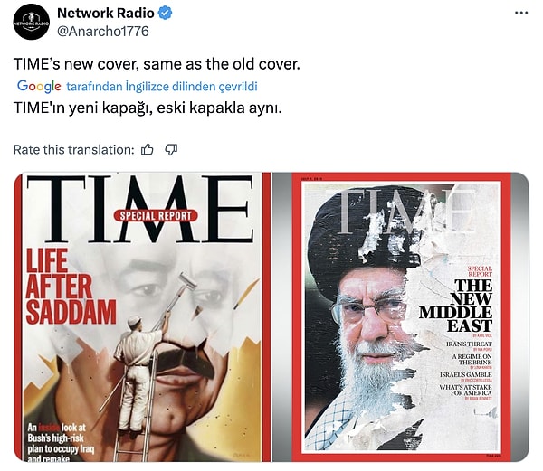 ABD merkezli Time dergisi, 19 Haziran’da İran lideri Hamaney kapağıyla yayınlandı. Kapakta Hamaney’in bir kısmı yırtılmış fotoğrafı yer alırken “The New Middle East” (Yeni Orta Doğu) başlığı atıldı. Kapak toplumsal medyada gündem oldu. Kullanıcılar Time mecmuasının geçmiş yıllardaki Saddam ve Kaddafi kapaklarını hatırlattı.