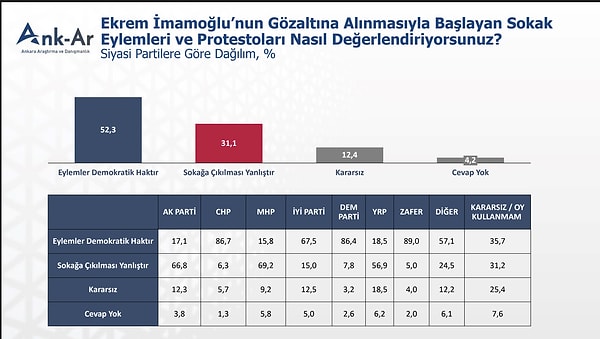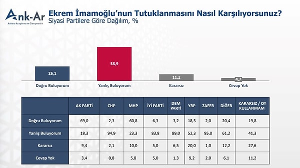%58.9 kararı yanlış bulduğunu beyan ederken %25.1 gerçek buluyor. Kararsızların %41 oranında tutuklamayı yanlış bulması da dikkat cazibeli bir ayrıntı.