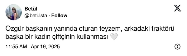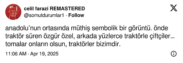 Özgür Özel kendisini bekleyen uzun traktör kuyruklarının akabinde konvoyun en önündeki traktörün direksiyonuna geçerek tarihi bir imgeye imza attı. Bilhassa muhalefetin büyük beğenisini kazanan imaj toplumsal medyada da büyük ilgi ile karşılandı.