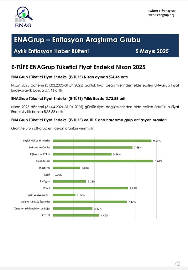 Bağımsız Enflasyon Araştırma Kümesi (ENAG) datalarına nazaran Nisan ayında enflasyon aylık bazda yüzde 4,46 artarken yıllık bazda ise yüzde 73,88 olarak gerçekleşti.
