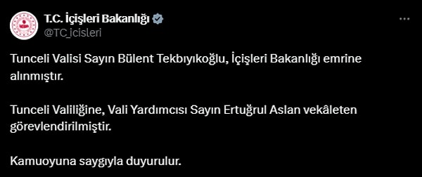 İçişleri Bakanlığı Tunceli Valisi Bülent Tekbıyıkoğlu’nun merkeze çekildiğini açıkladı. İçişleri Bakanlığı tarafından yapılan açıklamada, ‘Tunceli Valisi Sayın Bülent Tekbıyıkoğlu, İçişleri Bakanlığı buyruğuna alınmıştır. Tunceli Valiliğine, Vali Yardımcısı Sayın Ertuğrul Aslan vekâleten görevlendirilmiştir. Kamuoyuna hürmetle duyurulur.’ ifadeleri kullanıldı.