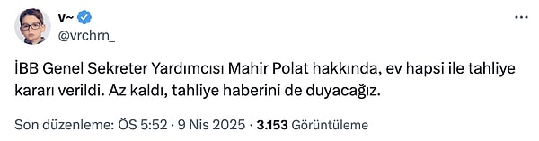İBB Soruşturması kapmasında Ekrem İmamoğlu ile birlikte tutuklanan İBB Genel Sekreter Yardımcısı Mahir Polat, konut mahpusu kuralıyla tahliye edildi. Bilhassa toplumsal medyada Polat’ın özgür kalması için çeşitli kampanyalar başlatılmıştı. Yetenekli Polat’ın tahliyesi, toplumsal medya kullanıcıları tarafından sevinçle karşılandı.