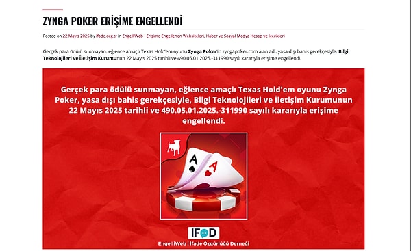 Bilgi Teknolojileri ve İletişim Kurumu (BTK), dün (22 Mayıs) 490.05.01.2025.-311990 sayılı kararı ile zyngapoker.com’a erişim pürüzü getirdi. Münasebet olarak, ”yasa dışı bahis” denildi.
