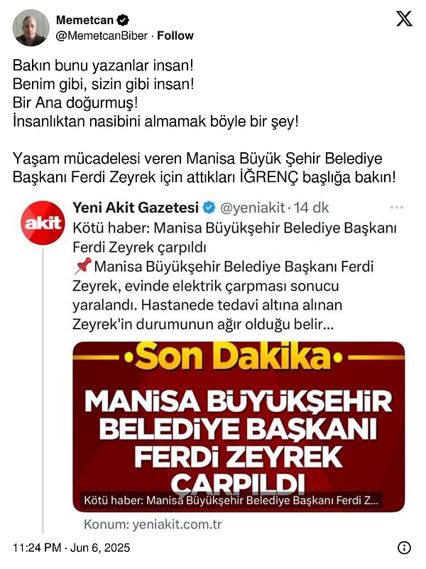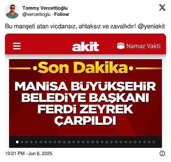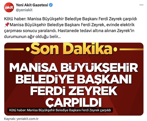 Yeni Akit’in X hesabındaki paylaşımı şu biçimdeydi;