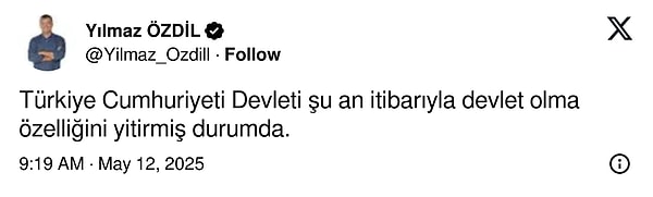 İstanbul Cumhuriyet Başsavcılığı, gazeteci Yılmaz Özdil’in “Türkiye Cumhuriyeti Devleti şu an prestijiyle devlet olma özelliğini yitirmiş durumda.” paylaşımı nedeniyle soruşturma başlattı.