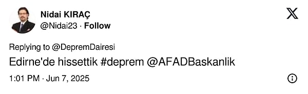 ‘Kuzey Anadolu Kırığının Ege Denizi batısında Selanik Akrotrios Yarımadasında M5,4-M5,7 büyüklüğünde olan zelzele Kuzey Marmarayı, Ege Kıyılarımızı etkilemez. Badire yok. Bayramınız kutlu olsun.’