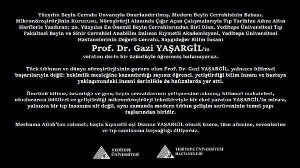 “Yüzyılın Beyin Cerrahı Unvanıyla Onurlandırılmış, Çağdaş Beyin Cerrahisinin Babası, Mikronöroşirürjinin Kurucusu, Nöroşirürji Alanında Çığır Açan Çalışmalarıyla Tıp Tarihine İsmini Altın Harflerle Yazdıran; 20. Yüzyılın En Kıymetli Beyin Cerrahlarından Biri Olan, Yeditepe Üniversitesi Tıp Fakültesi Beyin ve Hudut Cerrahisi Anabilim Kolunun Değerli Akademisyeni, Yeditepe Üniversitesi Hastanelerinin Kıymetli Cerrahı, Saygıdeğer Bilim İnsanı Prof. Dr. Gazi YAŞARGİL’in vefatını derin bir ıstırapla öğrenmiş bulunuyoruz.