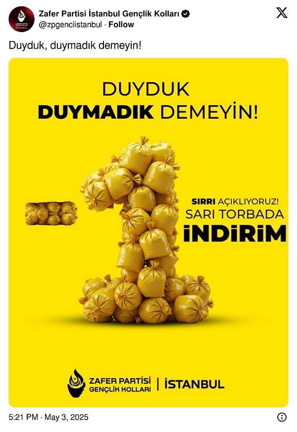 Zafer Partisi İstanbul Gençlik Kolları’nın Twitter hesabından paylaşılan gönderide, “Sırrı açıklıyoruz. Sarı torbada indirim” tabirleri yer aldı.