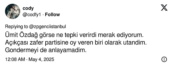 ‘Ümit Özdağ görse ne reaksiyon verirdi merak ediyorum. Açıkçası Zafer Partisi’ne oy veren biri olarak utandum. Göndermeyi de anlayamadım.’
