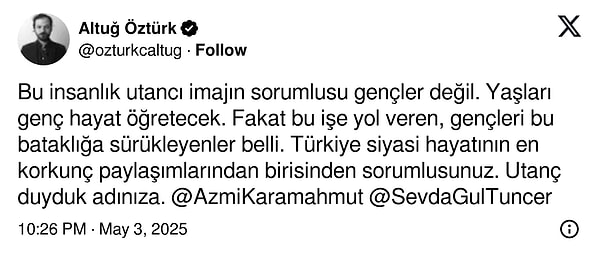 Bu insanlık utancı imajın sorumlusu gençler değil. Yaşları genç hayat öğretecek. Ancak bu işe yol veren, gençleri bu bataklığa sürükleyenler belirli. Türkiye siyasi hayatının en dehşetli paylaşımlarından birisinden sorumlusunuz. Utanç duyduk isminize.