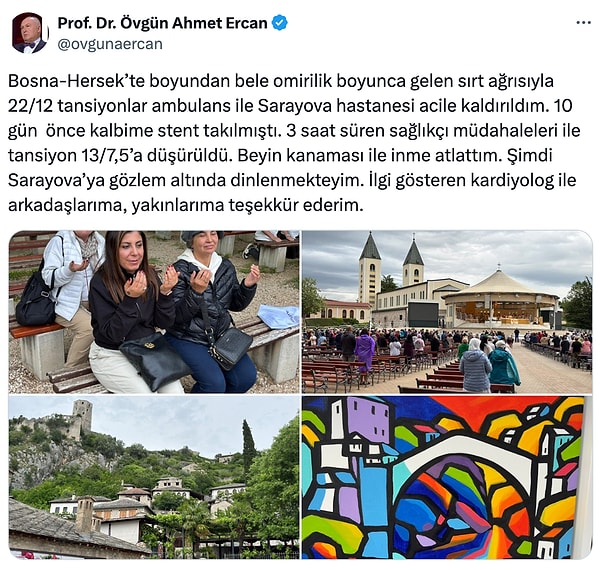 ‘Bosna-Hersek’te uzunluğundan bele omirilik boyunca gelen sırt ağrısıyla 22/12 tansiyonlar ambulans ile Sarayova hastanesi acile kaldırıldım. 10 gün evvel kalbime stent takılmıştı. 3 saat süren sağlıkçı müdahaleleri ile tansiyon 13/7,5’a düşürüldü. Beyin kanaması ile inme atlattım. Artık Sarayova’ya müşahede altında dinlenmekteyim. İlgi gösteren kardiyolog ile arkadaşlarıma, yakınlarıma teşekkür ederim.’